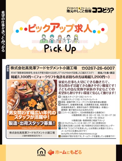 株式会社高見澤フードセグメント小諸工場☎0267-26-6007R141「御影新田南信号」を佐久平駅方面から左折して「ツルヤみかげ店様」入口越えてスグ!時給1,100円〜(フォークリフト免許をお持ちの方は時給1,200円〜)家庭も仕事も大切にできる働き方で、男女問わず活躍できる働きやすい職場です!子どもの急な発熱や家族の予定などでの希望休も取りやすい環境で安心して働けます!担当/小島・渡辺希望の仕事がきっとみつかる小諸市男女問わず幅広い年代のスタッフが活躍中!製造・出荷スタッフ募集!https://lactylife.com/株式会社高見澤フードセグメント小諸工場小諸市御影新田2576-1①製造スタッフ(2〜3名)※パート②出荷スタッフ(1名)※フルタイムパート資格・経験不問(フォークリフト免許保持者は優遇)昇給あり、各種保険完備、交通費規定支給、制服貸与従業員特典あり、資格手当あり(管理栄養士・栄養士・調理師・菓子衛生士などお持ちの方)[①パート]週2日〜、1日4時間程度から勤務OK!※勤務時間(例)8:00〜12:00、13:00〜17:309:00〜16:00など※勤務日数・勤務時間ご相談下さい♪[②フルタイムパート]8:00〜17:30(休憩90分)②週休2日制(土日祝・他)年間休日120日※弊社カレンダーまずは「ココどう?を見ました」とお気軽にお電話ください。メールでのご応募もOKです!lactylife.info@kk-takamisawa.co.jp従業員の7割が女性です。チームワークを重視している職場です!