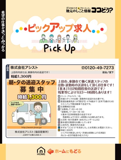 ☎0120-49-7273担当/宮下株式会社アシスト上田市内または、東御市内の送迎です!時給1,300円上田市希望の仕事がきっとみつかる朝・夕の送迎スタッフ募集中時給1,300円シニアの方活躍できます♪http://assist-jinzai.jp/株式会社アシスト(塩田営業所)上田市下之郷乙288-4上田市、東御市で働く派遣スタッフの出勤・退勤時の送迎をして頂くお仕事です!「基本」1日2時間程度の送迎です♪残業等により1日3〜4時間もあります!パート・アルバイト1名派遣スタッフの出勤・退勤時の送迎のお仕事です。普通自動車免許(AT限定可)※74歳まで(定年75歳のため)※ミニバンや軽自動車で送迎です。交通費規定支給「出勤時」7:00〜8:00「退勤時」17:00〜18:00※基本1日2時間程度の送迎ですが残業等により1日3〜4時間になる事もあります。土日祝・他大型連休(会社カレンダーによる)基本週5日勤務をお願いしています上田市内、東御市内の送迎まずは「ココどう?を見ました」とお気軽にお電話ください。時給1,300円シニアの方歓迎します♪(年齢は経験により応相談)月に5〜8万円程度の収入です♪