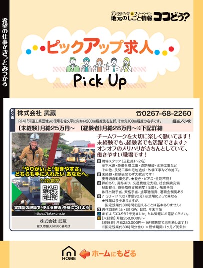 R141「河田工業団地」の信号を佐久平に向かい200m程度先を左折、その先100m程度の右手です。[未経験]月給25万円〜[経験者]月給28万円〜※下記詳細チームワークを大切に楽しく働いてます!未経験でも、経験者でも活躍できます♪オンオフのメリハリがきちんとしていて、働きやすい職場です!現場スタッフ(正社員1〜2名)※下水道・設備外構工事・道路舗装・水路工事などその他、民間工事の宅地造成・外構工事などの施工。未経験・経験者問わず大歓迎です!要普通自動車免許、★髪色・ピアス・性別不問!昇給あり、賞与あり、交通費規定支給、社会保険完備制服貸与、資格取得支援制度(全額)、残業手当休日出勤手当、資格手当、携帯通信費、退職金制度あり7:30〜17:00(休憩90分)※現場によって異なる★残業は多少ありますが、固定残業代30時間を超えることは基本ありません!週休2日制(土・日)GW、お盆、年末年始まずは「ココどう?を見ました」とお気軽にお電話ください。[未経験]月給250,000円〜[経験者]月給280,000円〜(研修期間で再判断します!)※固定残業代30時間分含む※研修期間:1ヶ月/同条件「やりがい」と「働きやすさ」どちらも手に入れたいあなたへ。メール問い合わせは↓↓こちらから↓↓実践型の現場で「使える技術」を身につけよう!https://takekura.jp株式会社武蔵佐久市猿久保586番地3希望の仕事がきっとみつかる佐久市株式会社武蔵☎0267-68-2260担当/小牧