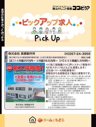株式会社高橋製作所☎0267-24-3959担当/山浦[新工場]マルオカ東信営業所様目の前[上田工場]蒼久保歯科医院様近く【正】①④月給22万円〜②月給19.5万円〜【パ】②③④時給1,120円〜希望の仕事がきっとみつかる小諸市・上田市いよいよSTART新工場稼働!新しい工場で活躍しませんか!<急募>1日3時間〜OK!事務パート※入力作業https://www.takahashi-ss-co.jp/株式会社高橋製作所[本社]小諸市大字滋野甲2509-1<<新工場稼働>>に伴いスタッフ募集中!NEWスタッフをどんどん募集します♪正社員・パート同時募集中!経験者から未経験者まで幅広く募集中です。【正社員】3名以上(新工場)【パート】5名以上(新工場・上田工場)①【正】マシニングセンターオペレーター、CNC旋盤オペレーター②【正・パ】事務スタッフ③【パ】軽作業・着脱スタッフ④【正・パ】出荷・ピッキングスタッフ【正】昇給あり、賞与あり、制服貸与、安全靴・手袋あり社会保険完備、交通費規定支給、退職金共済、退職金制度あり【パ】昇給あり、制服貸与、社会保険完備、交通費規定支給【正】8:00〜17:00【パ】1日5〜6時間勤務でOK!【正】週休2日制(会社カレンダーあり)、GW、お盆、年末年始【パ】週3日〜4日勤務でOK!新工場/小諸市大字滋野甲2509-1上田工場/上田市蒼久保字村前1438-1【正】①月給220,000円〜280,000円②月給195,000円〜230,000円④月給220,000円〜250,000円【パ】②③④時給1,120円〜