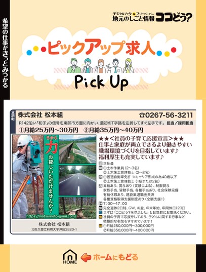 株式会社松本組☎0267-56-3211R142沿い「和子」の信号を東御市方面に向かい、最初のT字路を左折してすぐ左手です。担当/採用担当①月給25万円〜30万円②月給35万円〜40万円★★<社員の子育て応援宣言>★★仕事と家庭が両立できるより働きやすい職場環境づくりを目指しています♪福利厚生も充実しています♪正社員①土木作業員(2〜3名)②土木施工管理技士(2〜3名)①普通自動車免許※キャリア形成の為40歳以下②土木施工管理技士(1級または2級)昇給あり、賞与あり(実績による)、制服貸与家族手当、皆勤手当、各種手当あり、社会保険完備有給休暇あり、建設業退職金共済各種資格取得支援制度あり(全額支援!)7:00〜17:00完全週休2日制、GW、お盆、年末年始、年間休日120日まずは「ココどう?を見ました」とお気軽にお電話ください。社員の子育て応援をしており、子どもに関する行事など積極的な参加をすすめています!①月給250,000円〜300,000円②月給350,000円〜400,000円から力ちお貸しいただけませんか?https://matsumoto-gumi.com/株式会社松本組北佐久郡立科町大字田2820-1希望の仕事がきっとみつかる立科町