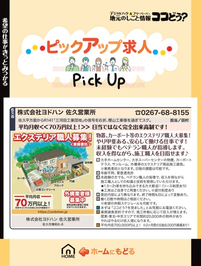 株式会社ヨドハン佐久営業所☎0267-68-8155佐久平方面からR141「三河田工業団地」の信号を右折、樫山工業様を過ぎてスグ。平均月収<<70万円以上!>>日当ではなく完全出来高制です!担当/田村希望の仕事がきっとみつかる佐久市エクステリア職人募集!エクステリア職人募集!<業務委託>物置オーニングガレージ砂利敷カーポートサンルームテラスデッキ人工芝アプローチフェンスブロック土間コンクリート門扉外構業者様募集中請負金額は都度ご相談させていただきます。平均月収70万円以上!研修中(2ヶ月)は日給8,000円補償あり!https://yodohan.jp株式会社ヨドハン佐久営業所佐久市横和6-8物置、カーポート等のエクステリア職人大募集!やり甲斐ある、安心して働ける仕事です!未経験でもベテラン職人が指導します。収入を得ながら、施工職人を目指せます♪大手ホームセンター、大手スーパーセンターの物置、カーポートテラス、サンルーム、外構等のエクステリア商品施工請負。※業務委託となります。日程の調整は可能です。年齢不問、要普通免許未経験の方でも、ベテラン職人の指導で、収入を得ながら施工職人としての知識と技術を習得していただけます。★1.5〜2t車を持ち込みできる方大歓迎!(リース制度あり)★工具はご自身でご用意ください。※貸付制度あり委託内容により異なります。終了時間も日によって変動あり。働く日数や時間はご相談ください。※希望の休暇スケジュールも可能です。まずは「ココどう?を見ました」とお気軽にお電話ください。業務請負契約ですので、施工件数に応じて収入が増えます。関東・東北・中京エリアで年間約20,000件の物件がありやればやるだけ収入増になります。平均月収700,000円以上!※2ヶ月間の日給8,000円補償あり!