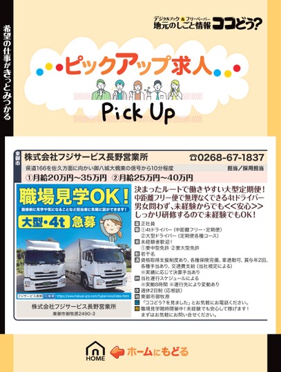 株式会社フジサービス長野営業所県道166を佐久方面に向かい御八城大橋東の信号から10分程度①月給20万円〜35万円②月給25万円〜40万円☎0268-67-1837担当/採用担当希望の仕事がきっとみつかる東御市職場見学OK!面接前に見学や気になることなど担当者に気軽に話ができます!大型・4t急募フジサービス長野https://www.hakuai-grp.com/fujiservice/index.html株式会社フジサービス長野営業所東御市御牧原2490-3決まったルートで働きやすい大型定期便!中距離フリー便で無理なくできる4tドライバー男女問わず、未経験からでも<<安心>>しっかり研修するので未経験でもOK!正社員①4tドライバー(中距離フリー・定期便)②大型ドライバー(定期便各種コース)未経験者歓迎!①要中型免許②要大型免許若干名資格取得支援制度あり、各種保険完備、車通勤可、賞与年2回、各種手当あり、交通費支給(当社規定による)※実績に応じて決算手当あり当社運行スケジュールによる※実働8時間※運行先により変動あり週休2日制(応相談)東御市御牧原「ココどう?を見ました」とお気軽にお電話ください。職場見学随時開催中!未経験でも安心して稼げます!まずはお気軽にお問い合せください。