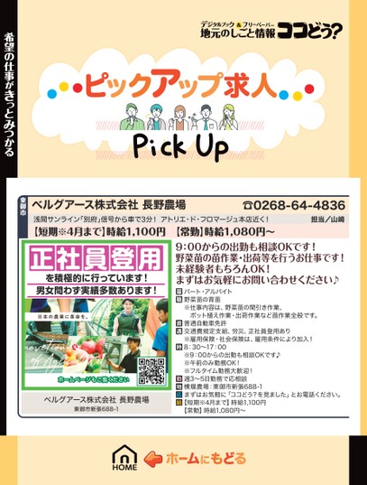 ベルグアース株式会社長野農場浅間サンライン「別府」信号から車で3分!アトリエ・ド・フロマージュ本店近く!【短期※4月まで】時給1,100円【常勤】時給1,080円〜☎0268-64-4836担当/山﨑正社員登用を積極的に行っています!男女問わず実績多数あります!ホームページもご覧くださいベルグアース株式会社長野農場東御市新張688-19:00からの出勤も相談OKです!野菜苗の苗作業・出荷等を行うお仕事です!未経験者もちろんOK!まずはお気軽にお問い合わせください♪パート・アルバイト野菜苗の育苗※仕事内容は、野菜苗の間引き作業、ポット植え作業・出荷作業など苗作業全般です。普通自動車免許交通費規定支給、労災、正社員登用あり※雇用保険・社会保険は、雇用条件により加入!8:30〜17:00※9:00からの出勤も相談OKです♪※午前のみ勤務OK!※フルタイム勤務大歓迎!週3〜5日勤務で応相談横堰農場:東御市新張688-1まずはお気軽に「ココどう?を見ました」とお電話ください。【短期※4月まで】時給1,100円【常勤】時給1,080円〜希望の仕事がきっとみつかる東御市