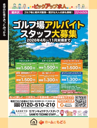 軽井沢ゴルフ場と軽井沢散策…贅沢な大人の旅も満喫!リゾートバイトゴルフ場アルバイトスタッフ大募集2026年4月〜11月末頃まで希望の仕事がきっとみつかるフロントスタッフ勤務時間7:00〜18:00(内、8時間)休憩60分、シフト制時給1,500円調理・調理補助スタッフ勤務時間7:00〜19:00(内、8時間)休憩60分、シフト制時給1,500円※調理師免許保有者は1,800円スタートスタッフ勤務時間7:00〜18:00(内、8時間)休憩60分、シフト制時給1,500円※要普通自動車免許洗い場スタッフ勤務時間7:00〜19:00(内、8時間)休憩60分、シフト制時給1,300円北佐久郡軽井沢町バンケットサービス勤務時間6:00〜23:00(内、8時間)休憩60分シフト制時給1,500円群馬県吾妻郡嬬恋村テーマパークスタッフ勤務時間7:00〜21:00(内、8時間)休憩60分シフト制時給1,200円,群馬県吾妻郡嬬恋村調理スタッフ勤務時間7:00〜21:00(内、8時間)休憩60分シフト制時給1,600円レストランサービス勤務時間7:00〜18:00(内、8時間)休憩60分、シフト制時給1,500円ガソリンスタンドスタッフ勤務時間8:00〜19:00(内、8時間)休憩60分、シフト制時給1,300円※要普通自動車免許※危険物乙4・整備士(3級)あれば尚可【雇用形態】アルバイト【受動喫煙対策】施設内禁煙(分煙)【待遇・特典】寮完備(住込可能)、食事補助赴任費、交通費支給(規定による)●短時間勤務希望の方●6時間〜勤務可能、ご相談下さい。もっと詳しく→二次元コードを読み取って詳細情報をチェックWebから応募電話でのご応募はこちら受付時間9:00〜17:30(月〜金)0120-510-210【群馬営業所】群馬県太田市高林寿町1808-3イングビルディング高林派遣派23-300122/紹介23-ユ-300248
