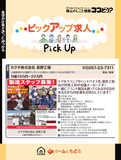 ☎0267-23-7311担当/堂本カクタ株式会社長野工場小諸高校から浅間サンラインに向かい、松井トンネルの手前です!月給19万円〜22万円小諸市製造スタッフ募集!やる気があって、長期的に勤務できる方お待ちしています!トグルクランプやハンドバイス等、製造工場向け特殊工具の老舗メーカーです!一緒にブランド製品を創ってくれるやる気のある方からの応募をお待ちしています!正社員(2名)工具の製造・組立44歳まで(省令3号のイ)、高卒以上普通自動車免許(AT限定可)経験者歓迎!未経験でもOK!昇給あり、賞与あり、社会保険完備、家族手当あり交通費規定支給、退職金制度あり8:00〜17:00週休2日制(土・日・その他)、GW、お盆、年末年始※会社カレンダーによる(年間休日121日)まずは「ココどう?を見ました」とお気軽にお電話ください。メールでもご応募いただけます。doumoto@kakuta-clamp.com特殊工具の老舗メーカーです。ぜひ当社のHPを閲覧してみてください!やる気のある方お待ちしています!月給190,000円〜220,000円https://www.kakuta-clamp.com/カクタ株式会社長野工場小諸市甲御堂上4533-1希望の仕事がきっとみつかる