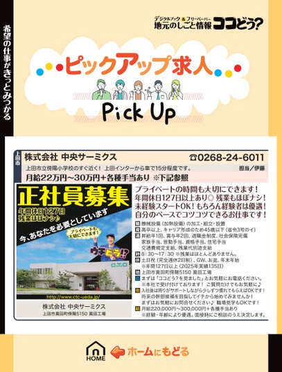 株式会社中央サーミクス上田市立傍陽小学校のすぐ近く!上田インターから車で15分程度です。月給22万円〜30万円+各種手当あり※下記参照☎0268-24-6011担当/伊藤プライベートの時間も大切にできます!年間休日127日以上あり◎残業もほぼナシ!未経験スタートOK!もちろん経験者は優遇!自分のペースでコツコツできるお仕事です!機械設備(加熱設備)の加工・組立・設置高卒以上、キャリア形成のため45歳以下(省令3号のイ)昇給年1回、賞与年2回、退職金制度、社会保険完備家族手当、皆勤手当、資格手当、住宅手当交通費規定支給、残業代別途支給8:30〜17:30※残業はほとんどありません。土日祝(完全週休2日制)、GW、お盆、年末年始※年間127日以上(2025年実績135日)上田市真田町傍陽5150真田工場まずは「ココどう?を見ました」とお気軽にお電話ください。※本社で受け付けております!ご質問だけでもお気軽に♪入社後は周りがサポートしながら少しずつ慣れてもらえばOKです!将来の幹部候補を目指してイチから始めてみませんか!まずはお気軽にお問合せください♪職場見学もOKです!月給220,000円〜300,000円+各種手当あり※経験・年齢により優遇。面接時にご相談のうえ決定します。正社員募集年間休日127日残業ほぼナシ♪要必をたな、あ今すまいてしとプライベートも大切にできます!http://www.ctc-ueda.jp/株式会社中央サーミクス上田市真田町傍陽5150真田工場希望の仕事がきっとみつかる上田市