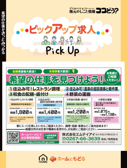 転職希望者大歓迎!未経験者大歓迎!希望の仕事を見つけよう!お気軽にご相談ください!①住込み可!レストラン調理③和食の配膳・盛付け②住込み可!温泉の巡回清掃と軽作業④野菜の運搬①住込み可!レストラン調理調理師免許所持者歓迎!②住込み可!温泉の巡回清掃と軽作業未経験者歓迎!③和食の配膳・盛付け勤務時間・日数共に相談可④野菜の運搬加工用レタスを作業台に運ぶ仕事万座温泉(群馬県)・パート・アルバイト時給1,800円万座温泉(群馬県)・パート・アルバイト時給1,400円時間/6:00〜22:00の間で実働8時間休日/シフト制(週休2日)交通費規定支給時間/6:00〜22:00の間で実働8時間休日/シフト制(週休2日)交通費規定支給佐久市・パート・アルバイト時給1,200円時間/5:30〜10:30(実働5時間)または5:30〜13:30(実働7時間)休日/シフト制(週休2日)交通費規定支給御代田町・派遣時給1,075円〜時給1,130円時間/8:00〜17:00(実働8時間)休日/シフト制(週休2日)交通費規定支給寮に入って仕事したい方もご相談ください。調理・清掃・事務などご案内出来ます!掲載以外のお仕事や職種を希望の方、お気軽にご相談ください。ホームページにてお仕事情報掲載!受付中!https://www.mti-jp.com/24時間登録株式会社エムテイアイ佐久市佐久平駅北26-3☎0267-66-3639厚生労働大臣許可●派遣:派20-110003/紹介:20-ユ-110002担当/採用担当希望の仕事がきっとみつかる