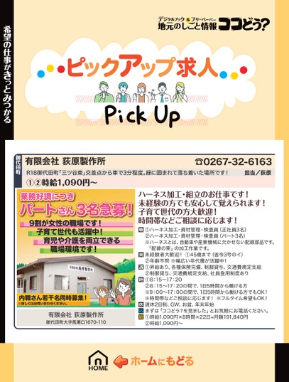 有限会社荻原製作所R18御代田町「三ツ谷東」交差点から車で3分程度。緑に囲まれて落ち着いた場所です!①②時給1,090円〜☎0267-32-6163担当/荻原希望の仕事がきっとみつかる御代田町業務好調につきパートさん3名急募!9割が女性の職場です!子育て世代も活躍中!育児や介護を両立できる職場環境です!内職さん若干名同時募集!※詳しくはお問い合わせください。有限会社荻原製作所御代田町大字馬瀬口1670-110ハーネス加工・組立のお仕事です!未経験の方でも安心して覚えられます!子育て世代の方大歓迎!時間帯などご相談に応じます!①ハーネス加工・資材管理・検査員(正社員3名)②ハーネス加工・資材管理・検査員(パート3名)※ハーネスとは、自動車や産業機械に欠かせない配線部品です。「配線の束」の加工作業です。未経験者大歓迎!①45歳まで(省令3号のイ)②年齢不問※幅広い年代層が活躍中!①昇給あり、各種保険完備、制服貸与、交通費規定支給②制服貸与、交通費規定支給、社員登用制度あり①8:15〜17:20②8:15〜17:20の間で、1日5時間から働ける方※9:00〜17:00の間で、1日5時間から働ける方でもOK!※時間帯などご相談に応じます!※フルタイム希望もOK!週休2日制、GW、お盆、年末年始まずは「ココどう?を見ました」とお気軽にお電話ください。①時給1,090円×8時間×22日=月額191,840円②時給1,090円〜