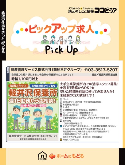 ☎03-3517-5207担当/軽井沢採用担当係興産管理サービス株式会社(商船三井グループ)自然豊かな軽井沢にある大手企業の保養所でのお仕事です!時給1,100円以上軽井沢希望の仕事がきっとみつかる清掃スタッフ8月は時給アップあり軽井沢保養所週1日勤務から応相談!主婦(夫)の方大歓迎!https://www.mo-kosan.co.jp/kks/興産管理サービス株式会社(商船三井グループ)東京都中央区日本橋本町3-3-6大手企業保養所内での清掃スタッフ募集!★週1日勤務からOK!★空いた時間を有効に使ってみませんか!未経験の方大歓迎です!パート清掃スタッフ(共用部・客室清掃のお仕事)未経験者大歓迎!1〜2名交通費規定支給、制服貸与、車通勤可10:00〜15:00(昼食休憩あり)週1日〜勤務OK!ご相談に応じます!※繁忙期に週5日フルで入ってくださる方も大歓迎!軽井沢町(軽井沢警察署近く)まずは「ココどう?を見ました」とお気軽にお電話ください。〒103-0023東京都中央区日本橋本町3-3-6興産管理サービス株式会社軽井沢採用担当係まで※面接は現地にて行います。初めての方でもOK!主婦(夫)の方大歓迎!時給1,100円以上