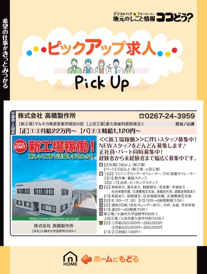 株式会社高橋製作所[新工場]マルオカ東信営業所様目の前[上田工場]蒼久保歯科医院様近く【正】①③月給22万円〜【パ】②③時給1,120円〜☎0267-24-3959担当/山浦希望の仕事がきっとみつかる小諸市・上田市いよいよSTART新工場稼働!新しい工場で活躍しませんか!<<新工場稼働>>に伴いスタッフ募集中!NEWスタッフをどんどん募集します♪正社員・パート同時募集中!経験者から未経験者まで幅広く募集中です。【正社員】3名以上(新工場)【パート】5名以上(新工場・上田工場)【正】マシニングセンターオペレーター、CNC旋盤オペレーター①②【パ】軽作業・着脱スタッフ③【正・パ】出荷・ピッキングスタッフ【正】昇給あり、賞与あり、制服貸与、安全靴・手袋あり社会保険完備、交通費規定支給、退職金共済、退職金制度あり【パ】昇給あり、制服貸与、社会保険完備、交通費規定支給【正】8:00〜17:00【パ】1日5〜6時間勤務でOK!【正】週休2日制(会社カレンダーあり)、GW、お盆、年末年始【パ】週3日〜4日勤務でOK!新工場/小諸市大字滋野甲2509-1上田工場/上田市蒼久保字村前1438-1【正】①月給220,000円〜280,000円③月給220,000円〜250,000円【パ】②③時給1,120円〜https://www.takahashi-ss-co.jp/株式会社高橋製作所[本社]小諸市大字滋野甲2509-1