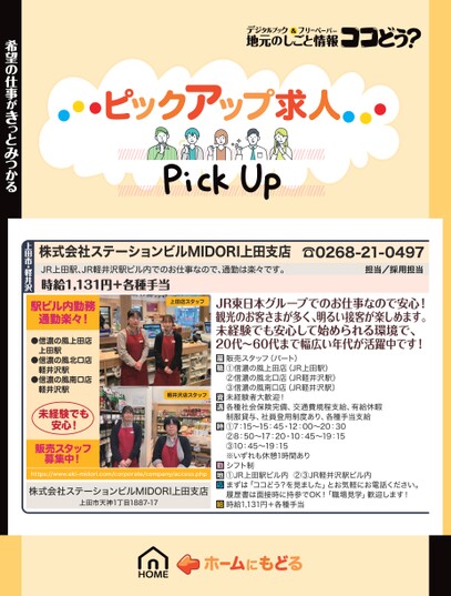 上田店スタッフJR東日本グループでのお仕事なので安心!観光のお客さまが多く、明るい接客が楽しめます。未経験でも安心して始められる環境で、20代〜60代まで幅広い年代が活躍中です!☎0268-21-0497担当/採用担当株式会社ステーションビルMIDORI上田支店JR上田駅、JR軽井沢駅ビル内でのお仕事なので、通勤は楽々です。時給1,131円+各種手当上田市・軽井沢希望の仕事がきっとみつかる駅ビル内勤務通勤楽々!●信濃の風上田店上田駅●信濃の風北口店軽井沢駅●信濃の風南口店軽井沢駅未経験でも安心!販売スタッフ募集中!軽井沢店スタッフ販売スタッフ(パート)①信濃の風上田店(JR上田駅)②信濃の風北口店(JR軽井沢駅)③信濃の風南口店(JR軽井沢駅)未経験者大歓迎!各種社会保険完備、交通費規程支給、有給休暇制服貸与、社員登用制度あり、各種手当支給①7:15〜15:45・12:00〜20:30②8:50〜17:20・10:45〜19:15③10:45〜19:15※いずれも休憩1時間ありシフト制①JR上田駅ビル内②③JR軽井沢駅ビル内まずは「ココどう?を見ました」とお気軽にお電話ください。履歴書は面接時に持参でOK!「職場見学」歓迎します!時給1,131円+各種手当https://www.eki-midori.com/corporate/company/access.php株式会社ステーションビルMIDORI上田支店上田市天神1丁目1887-17