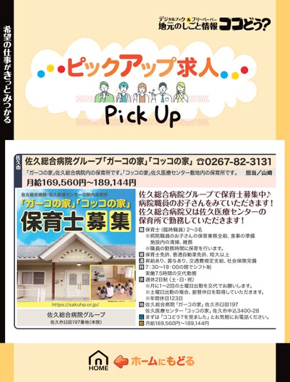 佐久総合病院グループ「ガーコの家」コッコの家」☎0267-82-3131「ガーコの家」佐久総合病院内の保育所です。コッコの家」佐久医療センター敷地内の保育所です。月給169,560円〜189,144円担当/山崎希望の仕事がきっとみつかる佐久市佐久総合病院・佐久医療センターの院内保育所「ガーコの家」コッコの家」保育士募集https://sakuhp.or.jp/佐久総合病院グループ佐久市臼田197番地(本院)佐久総合病院グループで保育士募集中♪病院職員のお子さんをみていただきます!佐久総合病院又は佐久医療センターの保育所で勤務していただきます!保育士(臨時職員)2〜3名※病院職員のお子さんの保育業務全般、食事の準備施設内の清掃、雑務※職員の勤務時間に保育を行います。保育士免許、普通自動車免許、短大以上昇給あり、賞与あり、交通費規定支給、社会保険完備7:30〜19:00の間でシフト制実働7.5時間の交代勤務週休2日制(土・日・祝)※月に1〜2回の土曜日出勤を交代でお願いします。※土曜日出勤の場合、振替休日を取得していただきます。※年間休日123日佐久総合病院「ガーコの家」佐久市臼田197佐久医療センター「コッコの家」佐久市中込3400-28まずは「ココどう?を見ました」とお気軽にお電話ください。月給169,560円〜189,144円