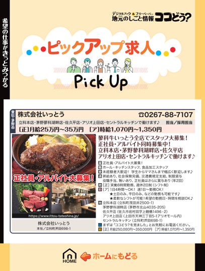 株式会社いっとう立科本店・茅野蓼科湖畔店・佐久平店・アリオ上田店・セントラルキッチンで働けます♪[正]月給25万円〜35万円[ア]時給1,070円〜1,350円☎0267-88-7107担当/採用担当希望の仕事がきっとみつかる東信・茅野市蓼科牛いっとう全店でスタッフ大募集!正社員・アルバイト同時募集中!立科本店・茅野蓼科湖畔店・佐久平店アリオ上田店・セントラルキッチンで働けます♪正社員・アルバイト大募集!ホール・キッチンスタッフ、食品加工スタッフ未経験者大歓迎!学生からママさんまで幅広く歓迎します♪昇給あり、社会保険完備、交通費規定支給、制服貸与役職手当、賄いあり、正社員はさらに賞与あり(年2回)[正]実働8時間勤務、週休2日制(シフト制)[ア]1日4時間〜OK!週1日〜勤務OK!★土日のみ、平日のみ、などの勤務も可能です♪★柔軟なシフトが可能!希望の勤務日・時間を相談OK♪立科本店(立科町茂田井2500ー1)茅野蓼科湖畔店(茅野市北山4035-205)佐久平店(佐久市岩村田字上橋1496‐2)アリオ上田店(上田市天神三丁目5-1アリオモール内)セントラルキッチン(立科町田698-1)まずは「ココどう?を見ました」とお気軽にお電話ください。[正]月給250,000円〜350,000円[ア]時給1,070円〜1,350円正社員・アルバイト大募集!https://www.ittou-tateshina.jp/株式会社いっとう本社/立科町田698-1