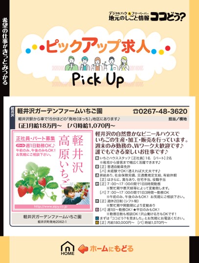 軽井沢ガーデンファームいちご園軽井沢駅から車で15分ほどの「発地(ほっち)」地区にあります♪[正]月給18万円〜[パ]時給1,070円〜☎0267-48-3620担当/横地希望の仕事がきっとみつかる軽井沢軽井沢の自然豊かなビニールハウスでいちごの生産・加工・販売を行っています。週末のみ勤務の、Wワーク大歓迎です♪誰でもできる楽しいお仕事です♪いちごハウススタッフ[正社員]1名[パート]2名※栽培から接客まで幅広く活躍できます♪[正]普通自動車免許[パ]未経験でOK!通えれば大丈夫です♪昇給あり、社会保険完備、交通費規定支給、有給休暇[正]はさらに、賞与あり、住宅手当、役職手当[正]7:00〜17:00の間で1日8時間勤務※繁忙期や悪天候等によって変動致します。[パ]7:00〜17:00の間で1日3時間〜勤務OK※午前のみ、午後のみもOK!お気軽にご相談下さい。[正]週休2日制(シフト制)※繁忙期や閑散期により変動あり[パ]週1日〜勤務OK!★平日のみもOK!※勤務日数も相談OK!沢山働ける方もOKです!まずは「ココどう?を見ました」とお気軽にお電話ください。[正]月給180,000円〜[パ]時給1,070円〜軽井沢高原正社員・パート募集週1日勤務OK♪パート午前のみ、午後のみもOK!お気軽にご相談下さい。http://www.aipy.co.jp軽井沢ガーデンファームいちご園軽井沢町発地2062-1