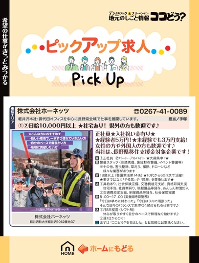株式会社ホーネッツ軽井沢本社・御代田オフィスを中心に長野県全域で仕事を展開しています。①②日給10,000円以上★社宅あり!県外の方も歓迎です♪☎0267-41-0089担当/手塚★こんな方におすすめ★・新しい環境で、一歩ずつ慣れていきたい方・自分のペースで働きたい方・地域に貢献したい方正社員★入社祝い金有り★★経験者5万円!★未経験でも3万円支給!女性の方や外国人の方も歓迎です♪当社は、長野県移住支援金対象企業です!①正社員②パート・アルバイト★大募集中!★警備スタッフ(交通誘導、施設駐在警備、イベント警備等)※その他、害虫駆除、草刈り、掃除、ドローンなど様々な業務があります18歳以上(警備業法第14条)★10代から60代まで活躍!★若さではなく「やる気」や「経験」を尊重します★①昇給あり、社会保険完備、交通費規定支給、資格取得支援住宅手当、社員寮有り、制服備品等貸与、あんしん財団加入②交通費規定支給、制服備品等貸与、社会保険完備8:00〜17:00(実働8時間勤務)『今日は早めに終わった』『今日はフルで頑張った』そんな日々のバランスで無理なく続けられる仕事です♪①月8日程度(シフト制)休みが取りやすく自分のペースで無理なく働けます♪②週1日からOK!まずは「ココどう?を見ました」とお気軽にお電話ください。https://hornets.work株式会社ホーネッツ軽井沢町大字軽井沢1062番地37希望の仕事がきっとみつかる東信エリア