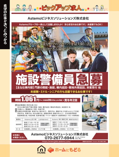 Astemoビジネスソリューションズ株式会社Astemoグループの一員として活躍しませんか!安心安定のお仕事です♪未経験でもOK!希望の仕事がきっとみつかる施設警備員急募【主な仕事内容】門扉の開錠・施錠、構内巡回・敷地外周巡回、来客受付他未経験・ミドル・シニアの方も活躍できるお仕事です!1,061円〜時給(月収例20万円以上も可能)・賞与年2回施設警備員(契約社員2名)【主な仕事内容】門扉の開錠・施錠、構内巡回・敷地外周巡回、来客受付他18歳以上(警備業法)学歴・年齢不問各種社会保険完備、家族手当(規定あり)、福利手当、通勤手当(片道1km以上で支給)深夜手当、残業手当、休日出勤手当、退職金制度(勤続3年以上)、正社員登用制度制服無償支給、有給休暇、駐車場完備、マイカー通勤OK(自動車保険加入※対人・対物無制限)勤務地Astemo上田(株)(上田市国分840)勤務時間休日勤務①7:00〜18:30勤務②18:30〜6:00勤務③20:30〜8:003日勤務し、2日休み※シフト制実働9.5時間休憩2時間Astemo(株)東御工場(東御市加沢801)勤務①7:00〜16:00勤務②15:00〜24:00勤務③23:00〜8:004日勤務し、2日休み※シフト制実働8時間休憩1時間お気軽にお電話くださいAstemoビジネスソリューションズ株式会社070-2677-6944https://www.jpbs.astemo.com/月〜金※平日のみ担当/横山東御市加沢801(Astemo(株)東御工場内)