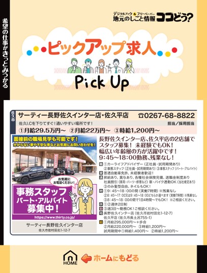 サーティー長野佐久インター店・佐久平店☎0267-68-8822佐久I.Cを下りてすぐ!通いやすい場所です!①月給29.5万円〜②月給22万円〜③時給1,200円〜担当/採用担当希望の仕事がきっとみつかる佐久市面接前の職場見学も可能です!分からない事や不安な事などお気軽にお問い合わせを!お気軽にお電話ください!事務スタッフパート・アルバイト募集中!https://www.thirty.co.jp/サーティー長野佐久インター店佐久市岩村田北1-12-7長野佐久インター店、佐久平店の2店舗でスタッフ募集!未経験でもOK!幅広い年齢層の方が活躍中です!9:45〜18:00勤務、残業なし!①カーライフアドバイザー(正社員・試用期間あり)②事務スタッフ(正社員・試用期間あり)③事務スタッフ(パート・アルバイト)普通自動車免許、未経験者歓迎!昇給あり、賞与あり、各種社会保険完備、退職金制度あり社員割引(車両・パーツ・修理など)車・バイク通勤OK(当社規定あり)③のみ髪型自由、ネイルもOK!①9:45〜18:00の間(実働7時間)※残業なし②8:45〜17:00又は9:45〜18:00どちらか選べます(実働7時間)※残業なし③8:45〜18:00の間で1日4時間〜でもOK!※ご相談ください。①②週休2日制③週3日〜勤務OK!ご相談ください。長野佐久インター店(佐久市岩村田北1-12-7)佐久平店(佐久市長土呂755-1)①月給295,000円〜+歩合②月給220,000円〜③時給1,200円〜試用期間中①時給1,400円〜②時給1,200円〜