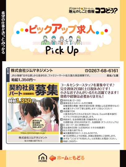 ☎0267-68-6161担当/土屋コールセンタースタッフを募集中です♪完全週休2日制(土日祝休み)です!小さなお子さんがいる方も活躍できます!資格や経験は必要ありません!契約社員(2〜3名)損保会社からのコール代行業務各種保険の異動・解約手続き処理(受電による変更受付など)★先輩スタッフが丁寧に説明します!ご安心ください!未経験でOK※基本的なPCスキルがある方(Word、Excelの基本操作)※ブランクのある方も歓迎します。昇給あり、社会保険完備(労働条件による)交通費支給(月50,000円まで)、私服勤務(オフィスカジュアル)8:45〜17:30(休憩60分)完全週休2日制(土日祝休み)※その他暦通り佐久市猿久保776-5★扶養範囲内のパートさんもOKです。★1日3時間以上で応相談。詳細は面接時にご説明します。まずは「ココどう?を見ました」とお気軽にお電話ください。時給1,350円〜お子さんの急な発熱お休みなども対応します♪https://jimmanage.co.jp/株式会社ジムマネジメント佐久市猿久保776-5株式会社ジムマネジメントJR小海線「北中込駅」から徒歩5分、ファミリーマート佐久猿久保店様隣です。時給1,350円〜契約社員募集パート(扶養範囲内)1,350円〜時給希望の仕事がきっとみつかる佐久市