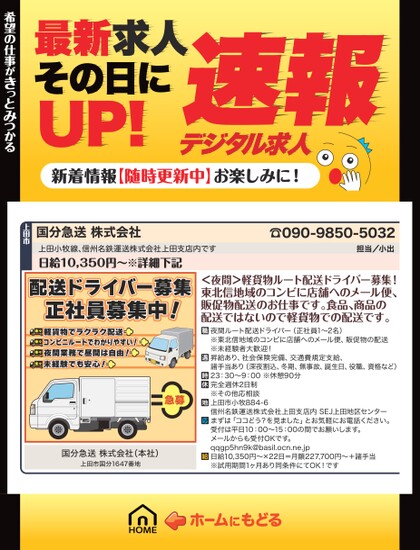 最新求人その日にUP!デジタル求人速報新着情報【随時更新中】お楽しみに!希望の仕事がきっとみつかる希望の仕事がきっとみつかる☎090-9850-5032担当/小出国分急送株式会社上田小牧線、信州名鉄運送株式会社上田支店内です日給10,350円〜※詳細下記上田市配送ドライバー募集正社員募集中!楽々軽貨物でラクラク配送楽々コンビニルートでわかりやすい!楽々夜間業務で昼間は自由!楽々未経験でも安心!急募国分急送株式会社(本社)上田市国分1647番地<夜間>軽貨物ルート配送ドライバー募集!東北信地域のコンビに店舗へのメール便、販促物配送のお仕事です。食品、商品の配送ではないので軽貨物での配送です。夜間ルート配送ドライバー(正社員1〜2名)※東北信地域のコンビに店舗へのメール便、販促物の配送※未経験者大歓迎!昇給あり、社会保険完備、交通費規定支給、諸手当あり(深夜割込、冬期、無事故、誕生日、役職、資格など)23:30〜9:00※休憩90分完全週休2日制※その他応相談上田市小牧884-6信州名鉄運送株式会社上田支店内SEJ上田地区センターまずは「ココどう?を見ました」とお気軽にお電話ください。受付は平日10:00〜15:00の間でお願いします。メールからも受付OKです。qqgp5hn9k@basil.ocn.ne.jp日給10,350円〜×22日=月額227,700円〜+諸手当※試用期間1ヶ月あり同条件にてOK!です