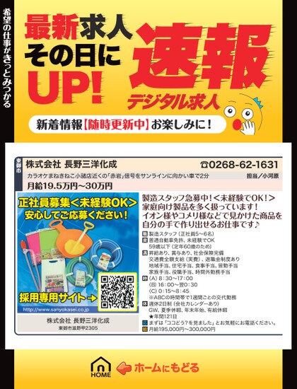 最新求人その日にUP!デジタル求人速報新着情報【随時更新中】お楽しみに!株式会社長野三洋化成カラオケまねきねこ小諸店近くの「赤岩」信号をサンラインに向かい車で2分月給19.5万円〜30万円☎0268-62-1631担当/小河原希望の仕事がきっとみつかる希望の仕事がきっとみつかる東御市正社員募集<未経験OK>安心してご応募ください!製造スタッフ急募中!<未経験でOK!>家庭向け製品を多く扱っています!イオン様やコメリ様などで見かけた商品を自分の手で作り出せるお仕事です♪製造スタッフ(正社員5〜6名)普通自動車免許、未経験でOK59歳以下(定年60歳のため)昇給あり、賞与あり、社会保険完備交通費全額支給(実費)、退職金制度あり地域手当、住宅手当、食事手当、皆勤手当家族手当、役職手当、時間外勤務手当(A)8:30〜17:00(B)16:00〜翌0:30(C)0:15〜8:45※ABCの時間帯で1週間ごとの交代勤務週休2日制(会社カレンダーあり)GW、夏季休暇、年末年始、有給休暇★年間121日まずは「ココどう?を見ました」とお気軽にお電話ください。月給195,000円〜300,000円採用専用サイトhttp://www.sanyokasei.co.jp株式会社長野三洋化成東御市滋野甲2305