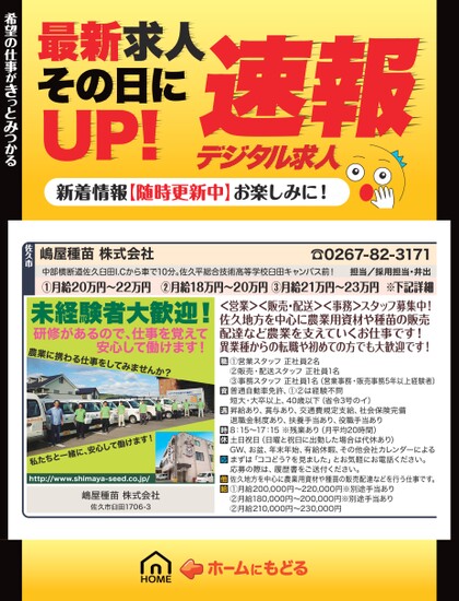 最新求人その日にUP!デジタル求人速報新着情報【随時更新中】お楽しみに!希望の仕事がきっとみつかる希望の仕事がきっとみつかる佐久市嶋屋種苗株式会社☎0267-82-3171担当/採用担当・井出中部横断道佐久臼田I.Cから車で10分。佐久平総合技術高等学校臼田キャンパス前!①月給20万円〜22万円②月給18万円〜20万円③月給21万円〜23万円※下記詳細<営業><販売・配送><事務>スタッフ募集中!佐久地方を中心に農業用資材や種苗の販売配達など農業を支えていくお仕事です!異業種からの転職や初めての方でも大歓迎です!未経験者大歓迎!農業に携わる仕事をしてみませんか?研修があるので、仕事を覚えて安心して働けます!①営業スタッフ正社員2名②販売・配送スタッフ正社員1名③事務スタッフ正社員1名(営業事務・販売事務5年以上経験者)普通自動車免許、①②は経験不問短大・大卒以上、40歳以下(省令3号のイ)昇給あり、賞与あり、交通費規定支給、社会保険完備退職金制度あり、扶養手当あり、役職手当あり8:15〜17:15※残業あり(月平均20時間)土日祝日(日曜と祝日に出勤した場合は代休あり)GW、お盆、年末年始、有給休暇、その他会社カレンダーによるまずは「ココどう?を見ました」とお気軽にお電話ください。応募の際は、履歴書をご送付ください。佐久地方を中心に農業用資材や種苗の販売配達などを行う仕事です。①月給200,000円〜220,000円※別途手当あり②月給180,000円〜200,000円※別途手当あり②月給210,000円〜230,000円緒に、安心して働けます!たちと一私http://www.shimaya-seed.co.jp/嶋屋種苗株式会社佐久市臼田1706-3