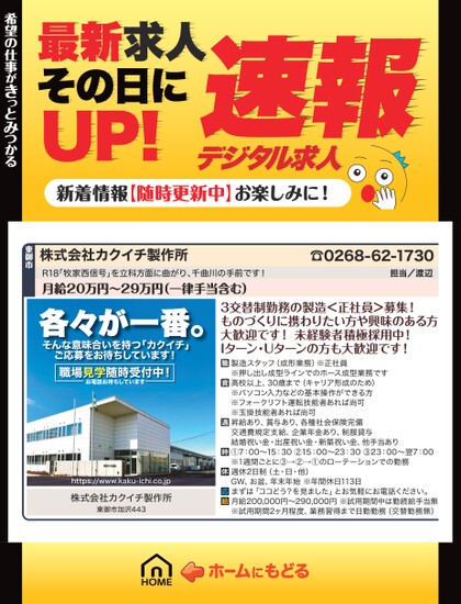 最新求人その日にUP!デジタル求人速報新着情報【随時更新中】お楽しみに!希望の仕事がきっとみつかる希望の仕事がきっとみつかる☎0268-62-1730担当/渡辺株式会社カクイチ製作所R18「牧家西信号」を立科方面に曲がり、千曲川の手前です!月給20万円〜29万円(一律手当含む)東御市各々が一番。そんな意味合いを持つ「カクイチ」3交替制勤務の製造<正社員>募集!ものづくりに携わりたい方や興味のある方大歓迎です!未経験者積極採用中!Iターン・Uターンの方も大歓迎です!ご応募をお待ちしています!職場見学随時受付中!お電話お待ちしていますhttps://www.kaku-ichi.co.jp株式会社カクイチ製作所東御市加沢443製造スタッフ(成形業務)※正社員※押し出し成型ラインでのホース成型業務です高校以上、30歳まで(キャリア形成のため)※パソコン入力などの基本操作ができる方※フォークリフト運転技能者あれば尚可※玉掛技能者あれば尚可昇給あり、賞与あり、各種社会保険完備交通費規定支給、企業年金あり、制服貸与結婚祝い金・出産祝い金・新築祝い金、他手当あり①7:00〜15:30②15:00〜23:30③23:00〜翌7:00※1週間ごとに③→②→①のローテーションでの勤務週休2日制(土・日・他)GW、お盆、年末年始※年間休日113日まずは「ココどう?を見ました」とお気軽にお電話ください。月給200,000円〜290,000円※試用期間中は勤続給手当無※試用期間2ヶ月程度、業務習得まで日勤勤務(交替勤務無)