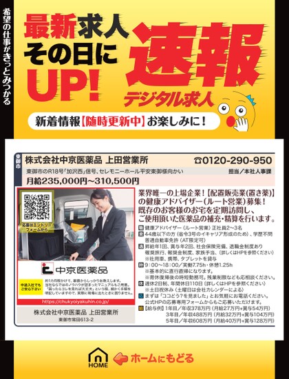 最新求人その日にUP!デジタル求人速報新着情報【随時更新中】お楽しみに!希望の仕事がきっとみつかる希望の仕事がきっとみつかる☎0120-290-950担当/本社人事課株式会社中京医薬品上田営業所東御市のR18号「加沢西」信号、セレモニーホール平安東御様向かい月給235,000円〜310,500円東御市応募はエントリーフォームから中途入社でもご安心下さい約1カ月程かけて、基礎からしっかりお教えします。当社ならではのノウハウが詰まったマニュアルもご用意。「困ったらコレを見れば大丈夫」という程、細かく手順を明記していますので、実際に現場に出たときに困りません。https://chukyoiyakuhin.co.jp/株式会社中京医薬品上田営業所東御市常田613-2業界唯一の上場企業!【配置販売業(置き薬)】の健康アドバイザー(ルート営業)募集!既存のお客様のお宅を定期訪問し、ご使用頂いた医薬品の補充・精算を行います。健康アドバイザー(ルート営業)正社員2〜3名44歳以下の方(省令3号のイキャリア形成のため)、学歴不問普通自動車免許(AT限定可)昇給年1回、賞与年2回、社会保険完備、退職金制度あり報奨旅行、報奨金制度、家族手当、(詳しくはHPを参照ください)※社用車、携帯、タブレットを貸与9:00〜18:00/実働7.75h・休憩1.25h※基本的に直行直帰になります。※育休復帰後の時短勤務可。残業制限なども応相談ください。週休2日制、年間休日110日(詳しくはHPを参照ください)※土日祝休み(土曜日は会社カレンダーによる)まずは「ココどう?を見ました」とお気軽にお電話ください。公式HPの応募専用フォームからもご応募いただけます。【給与例】1年目/年収378万円(月給27万円+賞与54万円)3年目/年収488万円(月給32万円+賞与104万円)5年目/年収608万円(月給40万円+賞与128万円)