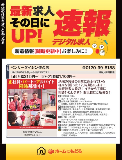 最新求人その日にUP!デジタル求人速報新着情報【随時更新中】お楽しみに!ベンリーケイジン佐久店JR小海線「中込駅」から徒歩3分です!☎0120-39-8188担当/採用担当希望の仕事がきっとみつかる希望の仕事がきっとみつかる佐久市[正]月給21万円〜[パ・ア]時給1,100円〜正社員・パート・アルバイト同時募集中!地域の皆様の日常にあふれている様々な「困った!?」を解決します!未経験者大歓迎!イチから丁寧に指導いたします♪お気軽にご応募を!①正社員(1名)②パート・アルバイト(1名)生活支援(便利屋)サービスクルー※掃除、水りの修理、庭の手入れや買い物代行など普通自動車免許、年齢・学歴不問①昇給あり、賞与あり、社会保険完備、交通費規定支給制服貸与、資格取得支援あり、研修期間あり②昇給あり、雇用・労災、交通費規定支給、制服貸与8:30〜17:30※パート・アルバイトは勤務時間相談OK!①週休2日制(シフト制、月平均9日)②週2〜3日勤務でOKです!※週5日勤務できる方歓迎です♪まずは「ココどう?を見ました」とお気軽にお電話ください。①月給210,000円〜(固定残業代は別途支給)※固定残業あり、月/20時間※固定残業代、月/30,000円②時給1,100円〜https://saku.benry.com/有限会社けいじん佐久市中込3-15-1