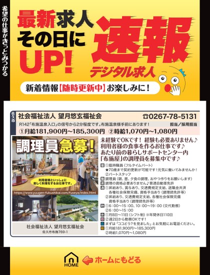 最新求人その日にUP!デジタル求人速報新着情報【随時更新中】お楽しみに!社会福祉法人望月悠玄福祉会☎0267-78-5131R142「布施温泉入口」の信号から2分程度です。布施温泉様手前にあります!①月給181,900円〜185,300円②時給1,070円〜1,080円担当/採用担当希望の仕事がきっとみつかる希望の仕事がきっとみつかる佐久市調理員急募!未経験でOKです!経験も必要ありません♪利用者様の食事を作るお仕事です♪あたり前の暮らしサポートセンター内「布施屋」の調理員を募集中です♪利用者様といっしょに楽しく料理をするお仕事です。https://www.yuugen-fukushikai.com/fuseya/index.html社会福祉法人望月悠玄福祉会佐久市布施769-1①臨時職員(フルタイムパート)★70歳まで契約更新が可能です!元気に働いてみませんか!②パートスタッフ調理員(朝、昼、夕食の調理、おやつ作りをお願いします)調理の資格必要ありません♪普通自動車免許①昇給あり、賞与あり、交通費規定支給、退職金共済各種社会保険完備、資格手当あり(調理師免許等)②昇給あり、交通費規定支給、各種社会保険完備資格手当あり(調理師免許等)①6:00〜15:00、10:00〜19:00(交代勤務)②6:00〜15:00①月8日〜11日(シフト制)※年間休日110日②週2日から勤務OKです!まずは「ココどう?を見ました」とお気軽にお電話ください。①月給181,900円〜185,300円②時給1,070円〜1,080円