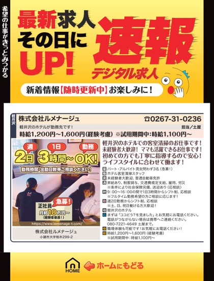 最新求人その日にUP!デジタル求人速報新着情報【随時更新中】お楽しみに!株式会社ルメナージュ☎0267-31-0236軽井沢のホテルが勤務先です!時給1,200円〜1,600円(経験考慮)※試用期間中:時給1,100円〜担当/土屋希望の仕事がきっとみつかる希望の仕事がきっとみつかる軽井沢2週日31日時間〜勤務OK!勤務時間・出勤日数等ご相談ください!急募!正社員18万円〜月給(経験者優遇!)https://www.lemenage-t.com/株式会社ルメナージュ小諸市大字柏木299-2軽井沢のホテルでの客室清掃のお仕事です!未経験者大歓迎!ママも活躍できるお仕事です!初めての方でも丁寧に指導するので安心!ライフスタイルに合わせて働ます!パート・アルバイト男女問わず3名(急募!)ホテル客室清掃スタッフ未経験者大歓迎、普通自動車免許昇給あり、制服貸与、交通費規定支給、雇用、労災※条件により社会保険完備、送迎あり(応相談)9:00〜16:00の間で1日3時間からシフト制、応相談※フルタイム勤務希望の方ご相談に応じます!週2日勤務からシフト制、応相談※土、日、祝日働ける方大歓迎!軽井沢のホテルまずは「ココどう?を見ました」とお気軽にお電話ください。電話がつながらない場合は携帯へご連絡ください。080-7221-4649土屋まで。職場体験も可能です!お気軽にお電話ください!時給1,200円〜1,600円(経験考慮)※試用期間中:時給1,100円〜
