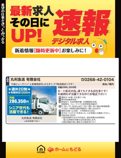 最新求人その日にUP!デジタル求人速報新着情報【随時更新中】お楽しみに!希望の仕事がきっとみつかる希望の仕事がきっとみつかる上田市千曲ビューライン「上長瀬南信号」からすぐ、FT物流様近くです!丸利急送有限会社★週休2日制★★年間休日120日★月給286,350円シニア世代も活躍できる!丸利急送有限会社上田市長瀬1722-1☎0268-42-0104担当/堀内月給286,350円ルート配送の為、誰でもできるお仕事です!年齢問わず活躍できるのでお電話下さい!運転手(4t車)正社員2〜3名準中型自動車免許昇給あり、社会保険完備、交通費規定支給制服貸与、フォークリフト免許取得支援あり6:00〜15:00または21:00〜翌6:00(週40時間勤務)※1日3〜4時間の固定残業あり(無い日もあり)週休2日制(土日祝)※年間休日120日まずは「ココどう?を見ました」とお気軽にお電話ください。月給286,350円※固定残業代78,375円含む。固定残業の66時間を超える時間外労働分は別途支給します。※固定残業が無い働き方も相談OKです!
