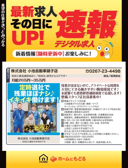 最新求人その日にUP!デジタル求人速報新着情報【随時更新中】お楽しみに!希望の仕事がきっとみつかる希望の仕事がきっとみつかる☎0267-23-4498担当/採用担当株式会社小池自動車硝子店和田工業流通団地近く、和田北」信号からスグです!月給20万円〜35万円東信エリア定時退社で残業ほぼナシ♪イキイキ働けます!https://koike-glass.jp/株式会社小池自動車硝子店[本店]小諸市大字市877-9残業がほぼないので、プライベートな時間を大切にできる働きやすい職場環境です♪未経験でも資格取得補助制度で応援します!整備スタッフ正社員募集中!整備スタッフ※正社員※自動車ガラスの交換・補修・リペアカーフィルム・ガラスクリーニングなど経験不問、要普通自動車免許、45歳まで(キャリア形成の為)2級整備士資格あれば尚可昇給あり、賞与あり、社会保険完備、交通費規定支給制服貸与、退職金制度あり、資格取得補助制度あり9:00〜18:00(休憩1時間)※基本的には定時退社日曜・祝日、第2・4土曜日、GW、お盆、年末年始小諸店(小諸市大字市877-9)上田店(上田市大字古里711-7)佐久店(佐久市大字取出町200-12)まずは「ココどう?を見ました」とお気軽にお電話ください。月給200,000円〜350,000円※試用期間3ヶ月あり(同条件)※経験・能力・前職給与に応じて、加給待遇します。
