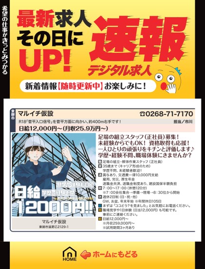 最新求人その日にUP!デジタル求人速報新着情報【随時更新中】お楽しみに!希望の仕事がきっとみつかる希望の仕事がきっとみつかる足場の組立スタッフ(正社員)募集!未経験からでもOK!資格取得も応援!一人ひとりの頑張りをキチンと評価します♪学歴・経験不問、職場体験にきませんか?足場の組立・解体作業スタッフ(正社員)35歳まで(キャリア形成のため)学歴不問、未経験者歓迎!賞与あり、交通費一律10,000円支給雇用、労災、厚生年金退職金共済、退職金制度あり、建設国保半額負担7:00〜17:00(休憩120分)※7:00会社集合→準備→現場→8:30位から開始週休2日制(日・祝・他)GW、お盆、年末年始※年間休日105日まずは「ココどう?を見ました」とお気軽にお電話ください。職場見学や1日体験(日当12,000円)も可能です。事前にご連絡ください。日給12,000円〜※月収259,000円〜※試用期間3ヶ月ありマルイチ仮設東御市滋野乙2129-1☎0268-71-7170担当/市川マルイチ仮設R18「菅平入口信号」を菅平方面に向かい、約400m右手です!日給12,000円〜(月収25.9万円〜)東御市