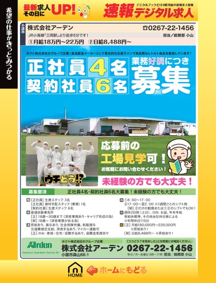 速報発刊前の速報求人情報デジタルブックだけのデジタル求人☎0267-22-1456担当/総務部小山最新求人その日にUP!株式会社アーデン小諸市JR小海線「三岡駅」より徒歩5分です!①月給18万円〜22万円②日給8,488円〜ホクト株式会社のグループ企業!食品製造メーカーとして衛生的な生産ラインで高品質なレトルト食品を製造しています!業務好調につき募集名名46正社契約社員応募前の工場見学可!未経験の方でも大丈夫!お気軽にお問い合わせください!正社員4名・契約社員6名大募集!未経験の方でも大丈夫!募集要項[正社員]生産スタッフ3名[正社員]資材手配スタッフ(事務)1名[契約社員]生産スタッフ6名普通自動車免許[正]18歳〜30歳まで(深夜業務あり・キャリア形成の為)[契]18歳〜(深夜業務がある為)昇給あり、賞与あり、社会保険完備、制服貸与交通費規定支給、深夜手当あり、マイカー通勤可[正]のみ:家族・住宅・役職手当あり、退職金制度あり[契]②だけの勤務または①②のシフトでもOK!①8:00〜17:00②17:00〜翌2:00※1週間ごとのシフト制週休2日制(土日)、GW、お盆、年末年始有給休暇等、その他当社休日表による※年間休日115日[正]月給180,000円〜220,000円※昇給あり![契]日給8,488円〜※昇給あり!ホクト株式会社のグループ企業株式会社アーデン0267-22-1456「ココどう?を見ました」とお気軽にお電話ください。受付/月〜金曜日8時〜17時担当/総務部小山小諸市森山66-1希望の仕事がきっとみつかる