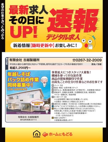 最新求人その日にUP!デジタル求人速報新着情報【随時更新中】お楽しみに!R18を小諸から御代田に向かい「平原東」信号を過ぎて左カーブの先の看板が目印!時給1,200円〜年越しそばパック詰め作業同時募集中!(11月・12月20日まで)シニア世代の方活躍中!https://www.furukoshi.co.jp/有限会社古越製麺所御代田町馬瀬口877-5事業拡大につきスタッフ大募集!機械を使っての包装作業商品の賞味期限印字作業出荷先ごとの仕分け作業などのお仕事ですパート5名製造・検品・出荷作業スタッフ高卒以上、普通自動車免許(AT限定可)、未経験者大歓迎!昇給あり、各種社会保険、交通費規定支給、制服貸与マイカー通勤OK、有給休暇8:00〜17:00※上記時間帯で働ける方を募集しています。※出勤日・時間などご相談に応じます!週休2日(日曜日・その他1日)※祝祭日は出勤(その他応相談)まずは「ココどう?を見ました」とお気軽にお電話ください。新しい工場の清潔な環境で汚れることもありません。年間を通して安定した室温で快適に仕事ができます!※年越しそばパック詰め作業同時募集中!(11月・12月20日まで)時給1,200円〜※経験者は優遇します!有限会社古越製麺所☎0267-32-2009担当/古越希望の仕事がきっとみつかる希望の仕事がきっとみつかる御代田町