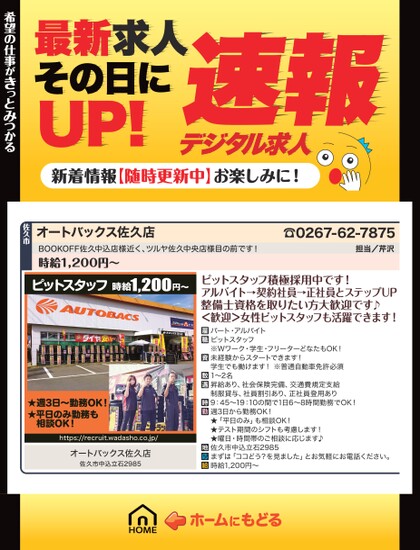 最新求人その日にUP!デジタル求人速報新着情報【随時更新中】お楽しみに!希望の仕事がきっとみつかる希望の仕事がきっとみつかる☎0267-62-7875担当/芹沢オートバックス佐久店BOOKOFF佐久中込店様近く、ツルヤ佐久中央店様目の前です!時給1,200円〜佐久市ピットスタッフ時給1,200円〜★週3日〜勤務OK!★平日のみ勤務も相談OK!https://recruit.wadasho.co.jp/オートバックス佐久店佐久市中込立石2985ピットスタッフ積極採用中です!アルバイト→契約社員→正社員とステップUP整備士資格を取りたい方大歓迎です♪<歓迎>女性ピットスタッフも活躍できます!パート・アルバイトピットスタッフ※Wワーク・学生・フリーターどなたもOK!未経験からスタートできます!学生でも働けます!※普通自動車免許必須1〜2名昇給あり、社会保険完備、交通費規定支給制服貸与、社員割引あり、正社員登用あり9:45〜19:10の間で1日6〜8時間勤務でOK!週3日から勤務OK!★「平日のみ」も相談OK!★テスト期間のシフトも考慮します!★曜日・時間帯のご相談に応じます♪佐久市中込立石2985まずは「ココどう?を見ました」とお気軽にお電話ください。時給1,200円〜