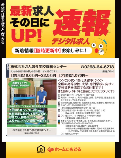 最新求人その日にUP!デジタル求人速報新着情報【随時更新中】お楽しみに!株式会社さんぽう学校資料センターしなの鉄道「田中駅」の目の前!すぐ近くです!☎0268-64-6218担当/市村[契]月給19.6万円〜22.5万円[ア]時給1,070円〜希望の仕事がきっとみつかる希望の仕事がきっとみつかる東御市通勤ラクラク!勤務地は田中駅前!<<<30代・40代活躍中!>>>全国の高等学校・大学・専門学校に向けて学校資料を発送するお仕事です!体を動かしイキイキと働きたい方にピッタリです♪◎体力を活かしてイキイキと働ける環境です♪人と触れ合うシゴトより体を適度に動かして働くことが好きだし、得意!というあなたに、ピッタリのお仕事です!https://company.sanpou-s.net/株式会社さんぽう学校資料センター東御市田中286-1契約社員(1名)、アルバイト(若干名)資料センター内で、資料の梱包、出荷、在庫管理、返送品整理などを担当していただきます。社会保険完備、有給休暇、交通費規定支給、車通勤可、駐車場完備9:00〜17:20(実働7時間20分)[契]土曜日の勤務時間9:00〜16:00[契]土曜月3回休み(日・祝・その他、暦通りです)GW、お盆・年末年始※年間休日115日[ア]週3日〜、1日5時間以上※時間帯応相談※夏期休暇、冬期休暇ありまずは「ココどう?を見ました」とお気軽にお電話ください。[契]月給196,000円〜225,000円※固定残業代20,110円〜23,090円※時間外手当は時間外労働の有無に関わらず固定残業代として支給し、15時間を超える場合は別途支給します。[ア]時給1,070円〜