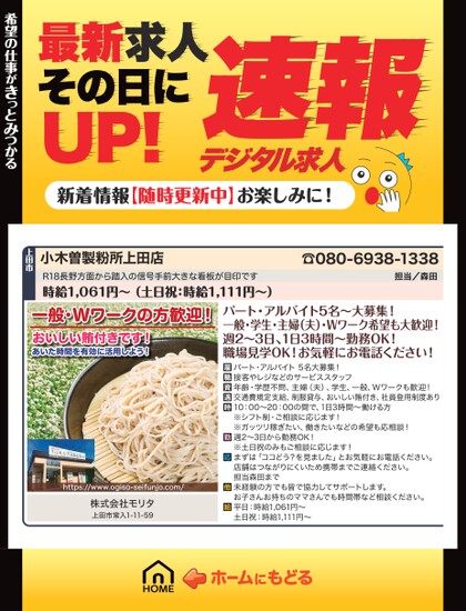 最新求人その日にUP!デジタル求人速報新着情報【随時更新中】お楽しみに!希望の仕事がきっとみつかる希望の仕事がきっとみつかるパート・アルバイト5名大募集!接客やレジなどのサービススタッフ年齢・学歴不問、主婦(夫)、学生、一般、Wワークも歓迎!交通費規定支給、制服貸与、おいしい賄付き、社員登用制度あり10:00〜20:00の間で、1日3時間〜働ける方※シフト制・ご相談に応じます!※ガッツリ稼ぎたい、働きたいなどの希望も応相談!週2〜3日から勤務OK!※土日祝のみもご相談に応じます!まずは「ココどう?を見ました」とお気軽にお電話ください。店舗はつながりにくいため携帯までご連絡ください。担当森田まで未経験の方でも皆で協力してサポートします。お子さんお持ちのママさんでも時間帯など相談ください。平日:時給1,061円〜土日祝:時給1,111円〜https://www.ogiso-seifunjo.com/株式会社モリタ上田市常入1-11-59☎080-6938-1338担当/森田小木曽製粉所上田店R18長野方面から踏入の信号手前大きな看板が目印です時給1,061円〜(土日祝:時給1,111円〜)上田市一般・Wワークの方歓迎!おいしい賄付きです!あいた時間を有効に活用しよう!パート・アルバイト5名〜大募集!一般・学生・主婦(夫)・Wワーク希望も大歓迎!週2〜3日、1日3時間〜勤務OK!職場見学OK!お気軽にお電話ください!