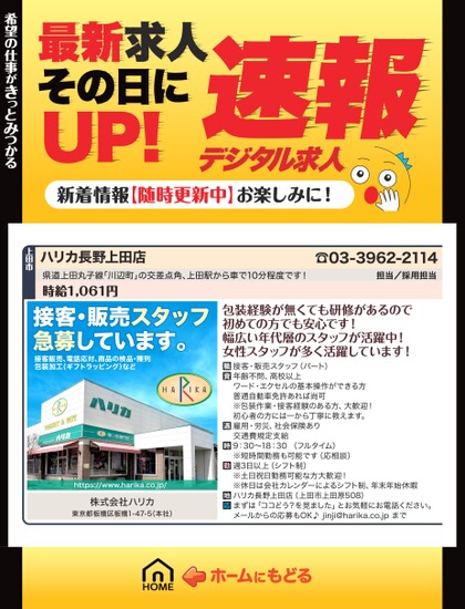 最新求人その日にUP!デジタル求人速報新着情報【随時更新中】お楽しみに!希望の仕事がきっとみつかる希望の仕事がきっとみつかる☎03-3962-2114担当/採用担当ハリカ長野上田店県道上田丸子線「川辺町」の交差点角、上田駅から車で10分程度です!時給1,061円上田市接客・販売スタッフ急募しています。接客販売、電話応対、商品の検品・陳列包装加工(ギフトラッピング)などhttps://www.harika.co.jp/株式会社ハリカ東京都板橋区板橋1-47-5(本社)包装経験が無くても研修があるので初めての方でも安心です!幅広い年代層のスタッフが活躍中!女性スタッフが多く活躍しています!接客・販売スタッフ(パート)年齢不問、高校以上ワード・エクセルの基本操作ができる方普通自動車免許あれば尚可※包装作業・接客経験のある方、大歓迎!初心者の方には一から丁寧に教えます。雇用・労災、社会保険あり交通費規定支給9:30〜18:30(フルタイム)※短時間勤務も可能です(応相談)週3日以上(シフト制)※土日祝日勤務可能な方大歓迎!※休日は会社カレンダーによるシフト制、年末年始休暇ハリカ長野上田店(上田市上田原508)まずは「ココどう?を見ました」とお気軽にお電話ください。メールからの応募もOK♪jinji@harika.co.jpまで