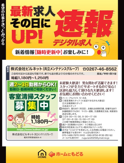 最新求人その日にUP!デジタル求人速報新着情報【随時更新中】お楽しみに!株式会社ビルネット(共立メンテナンスグループ)ご自宅付近から送迎も可能です。車でも追分駅より10分程のホテルです。時給1,180円〜1,250円☎0267-46-8562担当/中村・四ツ谷希望の仕事がきっとみつかる希望の仕事がきっとみつかる軽井沢週2〜3日勤務からOK!勤務日・勤務時間ご相談ください!客室清掃スタッフ募集中時給1,180円〜https://www.builnet.co.jp/株式会社ビルネット(共立メンテナンスグループ)軽井沢町発地864-4未経験大歓迎!男女問わず活躍できます!スタッフが全力でサポートするので安心!送迎も協力して頂ける方大歓迎します!お気軽にお問い合わせください!パート・アルバイト5〜6名①客室清掃スタッフ(※送迎できる方も大歓迎)②大浴場清掃スタッフ③送迎スタッフ昇給あり、賞与あり(年2回)、各種社会保険完備、各種手当あり扶養範囲内でもOK!マイカー通勤、交通費規定支給、制服貸与送迎も致します。①②9:00〜15:00、9:00〜17:00③7:00〜9:00・15:00〜17:00この間で勤務時間はご相談ください。週2〜3日勤務からOK!※ご相談に応じます軽井沢町発地(ルグラン軽井沢&リゾート内)まずは「ココどう?を見ました」とお気軽にお電話ください。携帯電話でも受付中!※土日も受付OK!070-1488-7870(中村)・080-9750-9136(四ツ谷)メールでも受付中!ruguran2025@ymail.ne.jp