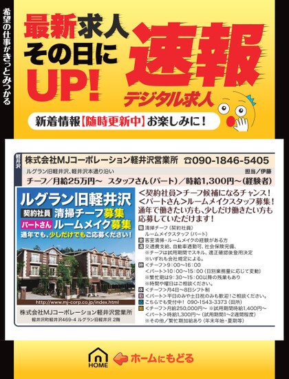 最新求人その日にUP!デジタル求人速報新着情報【随時更新中】お楽しみに!株式会社MJコーポレーション軽井沢営業所☎090-1846-5405ルグラン旧軽井沢、軽井沢本通り沿いチーフ/月給25万円〜スタッフさん(パート)/時給1,300円〜(経験者)担当/伊藤希望の仕事がきっとみつかる希望の仕事がきっとみつかる軽井沢ルグラン旧軽井沢清掃チーフ募集ルームメイク募集契約社員パートさん通年でも、少しだけでもご応募ください!http://www.mj-corp.co.jp/index.html株式会社MJコーポレーション軽井沢営業所軽井沢町軽井沢469-4ルグラン旧軽井沢2階<契約社員>チーフ候補になるチャンス!<パートさん>ルームメイクスタッフ募集!通年で働きたい方も、少しだけ働きたい方も応募していただけます!清掃チーフ(契約社員)ルームメイクスタッフ(パート)客室清掃・ルームメイクの経験がある方交通費支給、自動車通勤可、社会保険完備、※チーフは試用期間でスキル、適正確認後登用決定※いずれも会社規定による。<チーフ>9:00〜16:00<パート>10:00〜15:00(日別業務量に応じて変動)※繁忙期は9:30〜15:00以降の残業もあり※時間や曜日はご相談ください。<チーフ>月4日〜8日シフト制<パート>平日のみや土日祝のみも歓迎!ご相談ください。こちらでも受付中!090-1543-3373(田所)<チーフ>月給250,000円〜※試用期間時給1,400円〜<パート>時給1,300円〜(試用期間1〜2週間程度)※その他/繁忙期加給あり(年末年始・夏期等)
