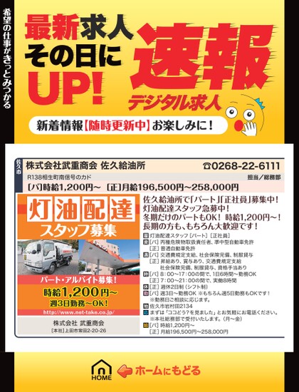 最新求人その日にUP!デジタル求人速報新着情報【随時更新中】お楽しみに!株式会社武重商会佐久給油所R138相生町南信号のカド☎0268-22-6111担当/総務部[パ]時給1,200円〜[正]月給196,500円〜258,000円灯油配達スタッフ募集パート・アルバイト募集!時給円〜1,200週3日勤務〜OK!http://www.net-take.co.jp/株式会社武重商会[本社]上田市常田2-20-26佐久給油所で「パート」正社員」募集中!灯油配達スタッフ急募中!冬期だけのパートもOK!時給1,200円〜!長期の方も、もちろん大歓迎です!灯油配達スタッフ[パート][正社員][パ]丙種危険物取扱責任者、準中型自動車免許[正]普通自動車免許[パ]交通費規定支給、社会保険完備、制服貸与[正]昇給あり、賞与あり、交通費規定支給社会保険完備、制服貸与、資格手当あり[パ]8:00〜17:00の間で、1日6時間〜勤務OK[正]7:00〜21:00の間で、実働8時間[正]週休2日制(シフト制)[パ]週3日〜勤務OK※もちろん週5日勤務もOKです!※勤務日ご相談に応じます。佐久市岩村田2134まずは「ココどう?を見ました」とお気軽にお電話ください。※本社総務部で受付いたします。(月〜金)[パ]時給1,200円〜[正]月給196,500円〜258,000円希望の仕事がきっとみつかる希望の仕事がきっとみつかる佐久市