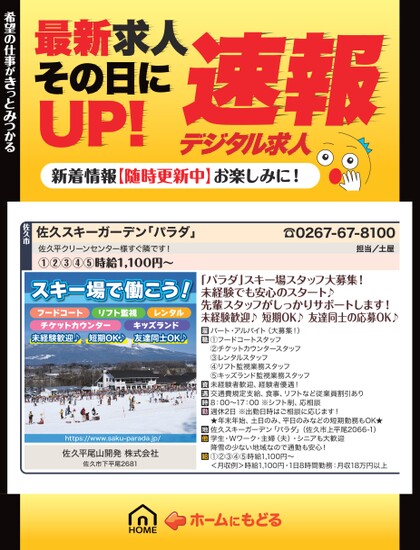 最新求人その日にUP!デジタル求人速報新着情報【随時更新中】お楽しみに!☎0267-67-8100担当/土屋佐久スキーガーデン「パラダ」佐久平クリーンセンター様すぐ隣です!①②③④⑤時給1,100円〜佐久市スキー場で働こう!フードコートリフト監視レンタルチケットカウンターキッズランド未経験歓迎♪短期OK♪友達同士OK♪https://www.saku-parada.jp/佐久平尾山開発株式会社佐久市下平尾2681「パラダ」スキー場スタッフ大募集!未経験でも安心のスタート♪先輩スタッフがしっかりサポートします!未経験歓迎♪短期OK♪友達同士の応募OK♪パート・アルバイト(大募集!)①フードコートスタッフ②チケットカウンタースタッフ③レンタルスタッフ④リフト監視業務スタッフ⑤キッズランド監視業務スタッフ未経験者歓迎、経験者優遇!交通費規定支給、食事、リフトなど従業員割引あり8:00〜17:00※シフト制、応相談週休2日※出勤日時はご相談に応じます!★年末年始、土日のみ、平日のみなどの短期勤務もOK★佐久スキーガーデン「パラダ」(佐久市上平尾2066-1)学生・Wワーク・主婦(夫)・シニアも大歓迎降雪の少ない地域なので通勤も安心!①②③④⑤時給1,100円〜<月収例>時給1,100円・1日8時間勤務:月収18万円以上