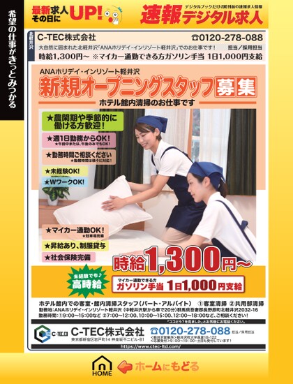 速報発刊前の速報求人情報デジタルブックだけのデジタル求人☎0120-278-088最新求人その日にUP!C-TEC株式会社北軽井沢担当/採用担当大自然に囲まれた北軽井沢「ANAホリデイ・インリゾート軽井沢」でのお仕事です!時給1,300円〜※マイカー通勤できる方ガソリン手当1日1,000円支給ANAホリデイ・インリゾート軽井沢新規オープニングスタッフホテル館内清掃のお仕事です募集★農閑期や季節的に働ける方歓迎!★週1日勤務からOK!★午前中または、午後のみでもOK!★勤務時間ご相談ください★勤務時間は様々に対応!★未経験OK!★WワークOK!★マイカー通勤OK!★駐車場完備★昇給あり、制服貸与★社会保険完備未経験でも♪高時給時給1,300円〜マイカー通勤できる方ガソリン手当日円支給1,0001ホテル館内での客室・館内清掃スタッフ(パート・アルバイト)①客室清掃②共用部清掃勤務地:ANAホリデイ・インリゾート軽井沢(中軽井沢駅から車で20分)群馬県吾妻郡長野原町北軽井沢2032-16勤務時間:①9:00〜15:00など②7:00〜12:00、10:00〜15:00、12:00〜18:00など、ご相談ください!C-TEC株式会社東京都新宿区岩戸町14神楽坂不二ビル-B1☎0120-278-088<軽井沢営業所>軽井沢町大字長倉18-122<応募受付>9:00〜19:00・土日も受付しています!担当/採用担当「ココどう?を見ました」とお気軽にお電話ください。https://www.ctec-ltd.com/