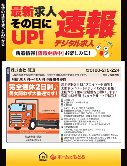 最新求人その日にUP!デジタル求人速報新着情報【随時更新中】お楽しみに!しなの鉄道大屋駅から車で6分。上田市立塩川小学校を越えてすぐです。月給30万円〜40万円※経験者優遇完全週休2日制♪男女問わず大歓迎です!完全週休2日制♪プライベード充実!大型ドライバー(平ボディ)2名大募集!上田から千葉の定期便をお願いします♪高速道路使用!決まったルートで輸送!大型(平ボディ)https://www.kai-dou.com/株式会社開道上田市塩川919-1正社員2名大型ドライバー(平ボディ)大型免許※フォークリフト免許あれば尚可各種社会保険完備、昇給あり、家族手当各種資格手当あり(月5,000円〜10,000円)資格取得支援制度あり、退職金共済、社員旅行など運行スケジュールによる※実働8時間上田から千葉の定期便をお願いします♪高速道路を使用して決まったルートで輸送します!完全週休2日制年末年始、お盆、その他会社カレンダーによる※年間休日105日以上まずは「ココどう?を見ました」とお気軽にお電話ください。研修や先輩社員のサポートもあるので、安心して働けます。月給300,000円〜400,000円(経験者優遇)株式会社開道☎0120-215-224担当/採用担当希望の仕事がきっとみつかる希望の仕事がきっとみつかる上田市