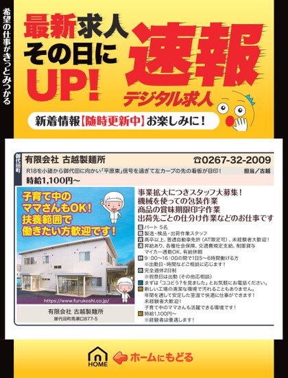 最新求人その日にUP!デジタル求人速報新着情報【随時更新中】お楽しみに!有限会社古越製麺所☎0267-32-2009担当/古越R18を小諸から御代田に向かい「平原東」信号を過ぎて左カーブの先の看板が目印!時給1,100円〜子育て中のママさんもOK!扶養範囲で働きたい方歓迎です!有限会社古越製麺所御代田町馬瀬口877-5事業拡大につきスタッフ大募集!機械を使っての包装作業商品の賞味期限印字作業出荷先ごとの仕分け作業などのお仕事ですパート5名製造・検品・出荷作業スタッフ高卒以上、普通自動車免許(AT限定可)、未経験者大歓迎!昇給あり、各種社会保険、交通費規定支給、制服貸与マイカー通勤OK、有給休暇9:00〜16:00の間で1日5〜6時間働ける方※出勤日・時間などご相談に応じます!完全週休2日制※祝祭日は出勤(その他応相談)まずは「ココどう?を見ました」とお気軽にお電話ください。新しい工場の清潔な環境で汚れることもありません。年間を通して安定した室温で快適に仕事ができます!未経験者大歓迎!子育て中のママさんも活躍できる環境です!時給1,100円〜※経験者は優遇します!希望の仕事がきっとみつかる希望の仕事がきっとみつかる御代田町