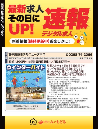 最新求人その日にUP!デジタル求人速報新着情報【随時更新中】お楽しみに!菅平高原ホテルニューダボス裏ダボスゲレンデの目の前、スキー場から徒歩0分にあるホテルです!時給1,100円〜※正社員同時募集中/月給18万円〜☎0268-74-2066担当/ヌタザワ希望の仕事がきっとみつかる希望の仕事がきっとみつかる菅平高原ウインターバイトウインターバイト◆12月下旬〜3月下旬のお仕事!◆短期アルバイト!稼げるお仕事です!キレイな寮完備で3食付きです♪働いた分だけ稼げて、生活費0円!未経験OK!幅広い年代が活躍中!★ホテル業務全般・清掃スタッフ募集パート・アルバイト(2〜3名)※時間応相談夏・冬のスポーツ合宿が多く、多くの学生さんと触れ合えるとてもヤリガイあるお仕事です。<正社員も同時募集中です!>月給180,000円〜(詳しい内容はお問合せ下さい)通年働ける正社員さんも大歓迎です!★住込みスタッフ募集※12月下旬〜3月下旬までのお仕事です!未経験でOKです!交通費規定支給、制服貸与、労災、まかない(3食付き)無料宿舎完備(テレビ・洗濯機付)、水道光熱費無料6:30〜19:30(実働8時間、休憩あり)短期のため、週1日程度(お休みは相談OK)まずは「ココどう?」を見ました!とお気軽にお電話下さい。時給1,100円〜https://www.new-davos.com菅平高原ホテルニューダボス上田市菅平高原1223-3790