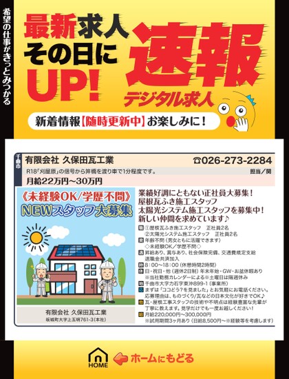 最新求人その日にUP!デジタル求人速報新着情報【随時更新中】お楽しみに!希望の仕事がきっとみつかる希望の仕事がきっとみつかる☎026-273-2284担当/関有限会社久保田瓦工業R18「刈屋原」の信号から笄橋を渡り車で1分程度です。月給22万円〜30万円千曲市《未経験OK/学歴不問》NEWスタッフ大募集有限会社久保田瓦工業坂城町大字上五明761-3(本社)業績好調にともない正社員大募集!屋根瓦ふき施工スタッフ太陽光システム施工スタッフを募集中!新しい仲間を求めています♪①屋根瓦ふき施工スタッフ正社員2名②太陽光システム施工スタッフ正社員2名年齢不問(男女ともに活躍できます)◇未経験OK/学歴不問◇昇給あり、賞与あり、社会保険完備、交通費規定支給退職金共済加入8:00〜18:00(休憩時間2時間)日・祝日・他(週休2日制)年末年始・GW・お盆休暇あり※当社勤務カレンダーによる※土曜日は隔週休み千曲市大字力石字東沖899-1(事業所)まずは「ココどう?を見ました」とお気軽にお電話ください。応募理由は、ものづくり/瓦などの日本文化が好きでOK♪瓦・屋根工事スタッフの技術や不明点は経験豊富な先輩が丁寧に教えます。見学だけでも一度お越しください!月給220,000円〜300,000円※試用期間3ヶ月あり(日給8,500円〜※経験等を考慮します)