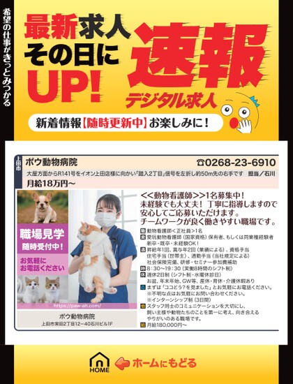 最新求人その日にUP!デジタル求人速報新着情報【随時更新中】お楽しみに!ポウ動物病院☎0268-23-6910大屋方面からR141号をイオン上田店様に向かい「踏入2丁目」信号を左折し約50m先の右手です月給18万円〜担当/石川希望の仕事がきっとみつかる希望の仕事がきっとみつかる上田市職場見学随時受付中!お気軽にお電話くださいhttps://paw-ah.com/ポウ動物病院上田市常田2丁目12-40石川ビル1F<<動物看護師>>1名募集中!未経験でも大丈夫!丁寧に指導しますので安心してご応募いただけます。チームワークが良く働きやすい職場です。動物看護師<正社員>1名愛玩動物看護師(国家資格)保有者、もしくは同業種経験者新卒・既卒・未経験OK!昇給年1回、賞与年2回(業績による)、資格手当住宅手当(世帯主)、通勤手当(当社規定による)社会保険完備、研修・セミナー参加費補助8:30〜19:30(実働8時間のシフト制)週休2日制(シフト制・水曜休診日)お盆、年末年始、GW等、産休・育休・介護休暇ありまずは「ココどう?を見ました」とお気軽にお電話ください。※不明な点はお気軽にお問い合わせください。※インターンシップ制(3日間)スタッフ同士のコミュニケーションを大切にし、飼い主様や動物たちのことを第一に考え、向き合えるやりがいのある職場です。月給180,000円〜